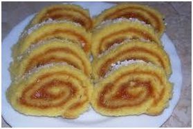 A megsült piskóta lapot azon forrón nedves konyharuhára fektetjük, kb. 10 dkg lekvárral megkenjük, az almatölteléket rásímítjuk. A tésztát felcsavarjuk, és kihűtjük.