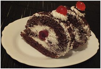 A krémhez a tejszínt az eritrittel, a vaníliával és a habfixálóval habosra keverjük. A piskótát kitekerjük és rákenjük a tejszínhabot, rászórjuk a meggyet és újra feltekerjük. A maradék tejszínnel a piskótatekercs külsejét is megkenjük, végül étcsokoládé forgáccsal díszítjük.