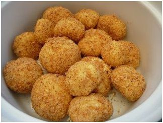 A zsemlemorzsát megpirítjuk nagyon kevés olajon, és beleforgatjuk a kész gombócokat.