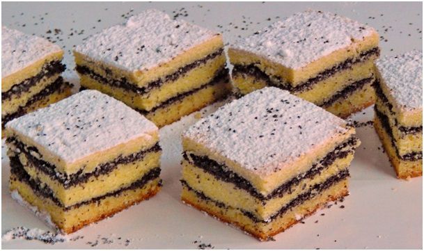 A cukros mákba belekeverjük a reszelt citromhéjat, és a felét ráhintjük a tésztára. Újra prószatészta következik, amit befedünk a mák másik felével. A tetejét teljesen betakarjuk a maradék kukoricás masszával. Ismét pihentetjük 10-15 percet, majd előmelegített sütőben megsütjük. Sütési hőfok : 180 fok, gáznál 3. fokozat